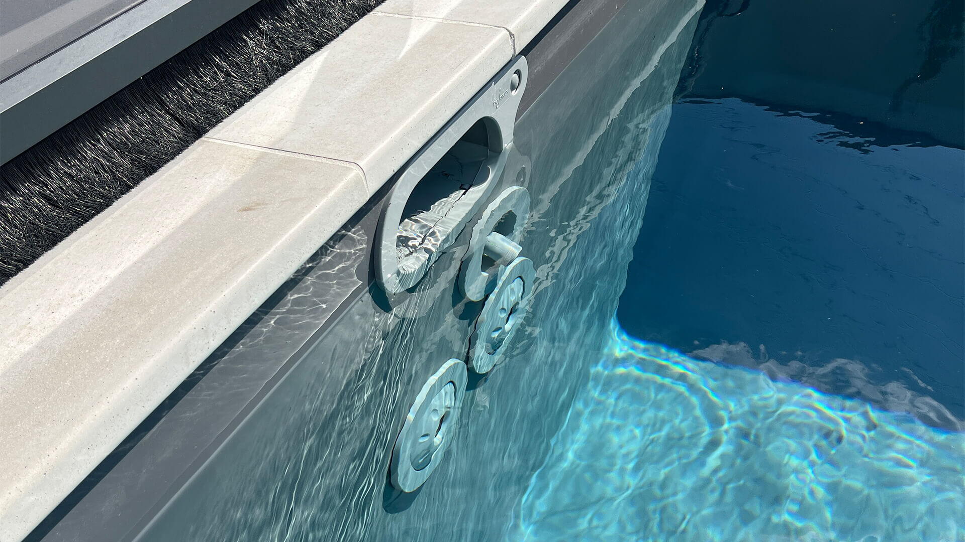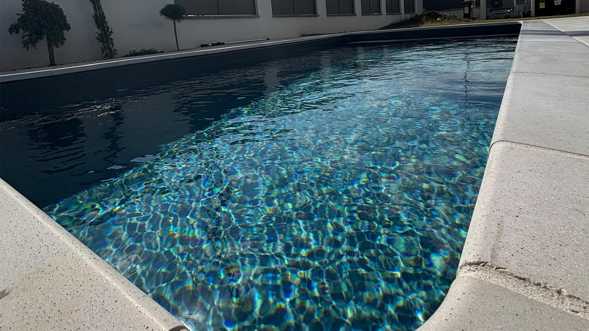 Ačkoliv se jedná o rodinný bazén, tak na první pohled byste to zřejmě nepoznali. Kromě technologie Desjoyaux je zde protiproud a automatika Desjoyaux JD Trio pro slanou vodu a dávkování pH. Prémiovost bazénu je zde také zapříčiněná barvou fólie (lineru). Ta je v antracitové barvě a okolí bazénu lemuje dlažba a obrubní kámen v betonovém stylu.