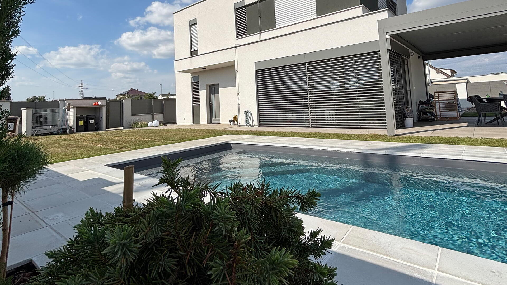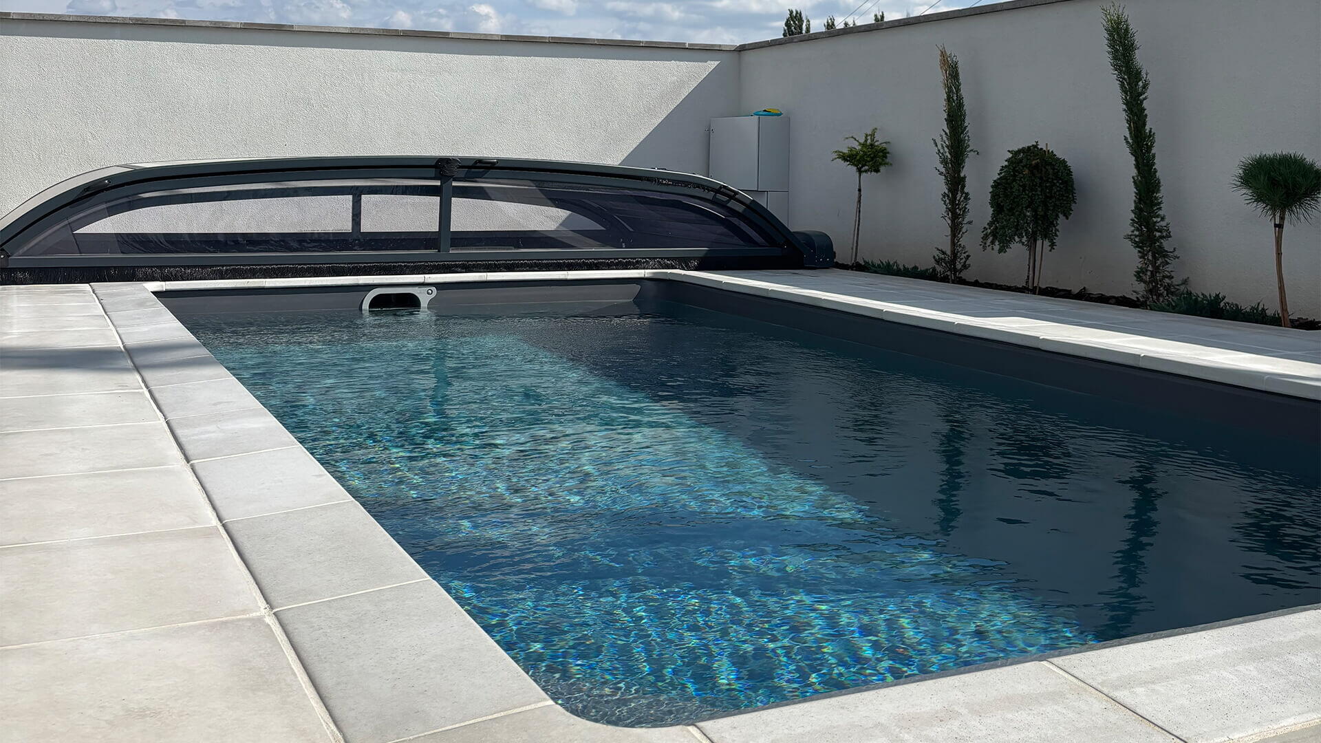V Hradci Králové jsme postavili bazén s antracitovým linerem, lavicí s rohovými schody a nízkým zastřešením se solárním pohonem a ovládáním pomocí ovladače. Klient si přál rozměr bazénu 6x3 metry a součástí je protiproud a automatika pro slanou vodu a dávkování chemie.