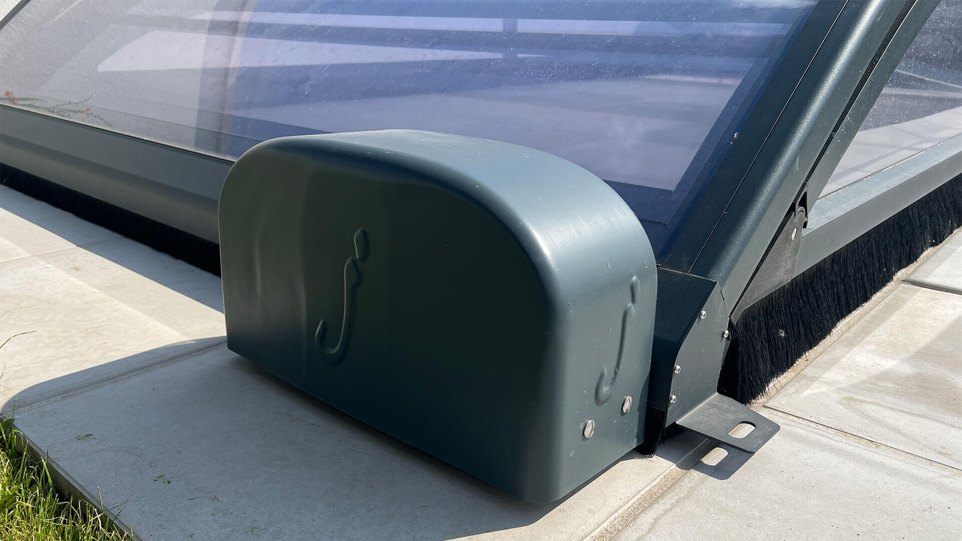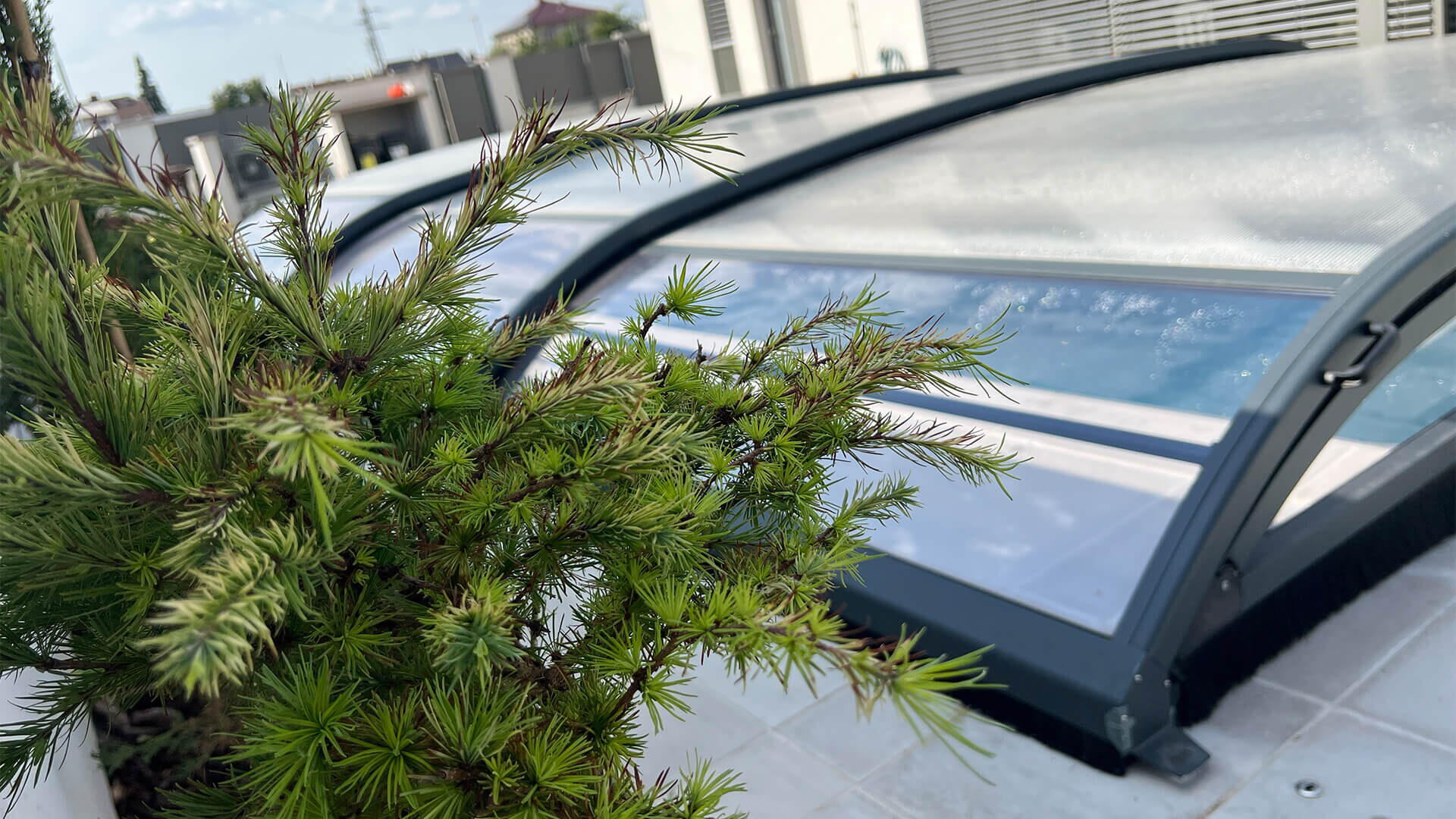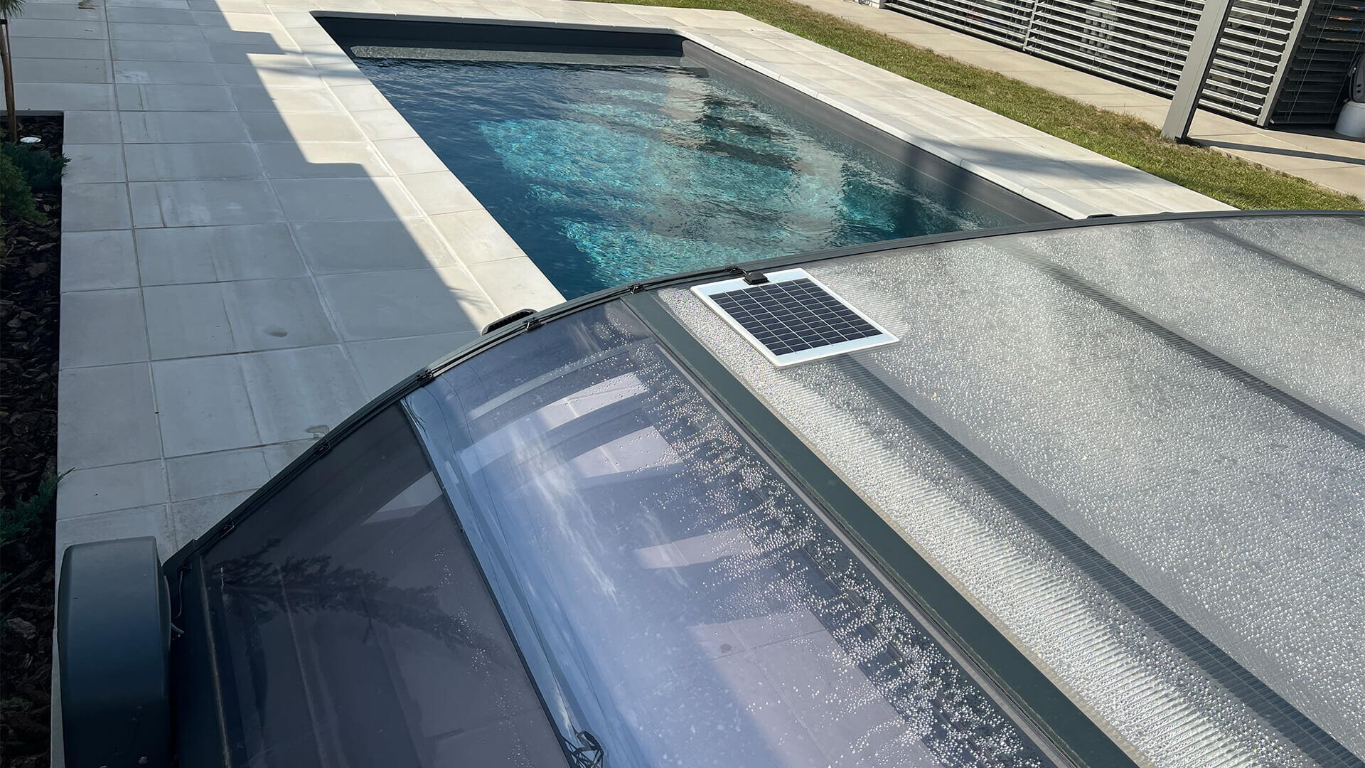 Pomyslnou „třešničkou na dortu“ u tohoto bazénu je jednoznačně jeho zastřešení, resp. solární pohon. Zastřešení si majitel vybral od společnosti Desjoyaux - nízké a v antracitové barvě. Odkrytí a zakrytí bazénu je možné standardně - ručně, a nebo pomocí elektrického (solárního) pohonu s ovládáním pomocí dálkového ovladače. Obrovskou výhodou je, že tento typ zastřešení nemá kolejnice, na které při odkrytí bazénu musíte koukat. U tohoto zastřešení jsou odolná silikonová kolečka uvnitř zastřešení a nepotřebují kolejnice, po kterých by jezdily.