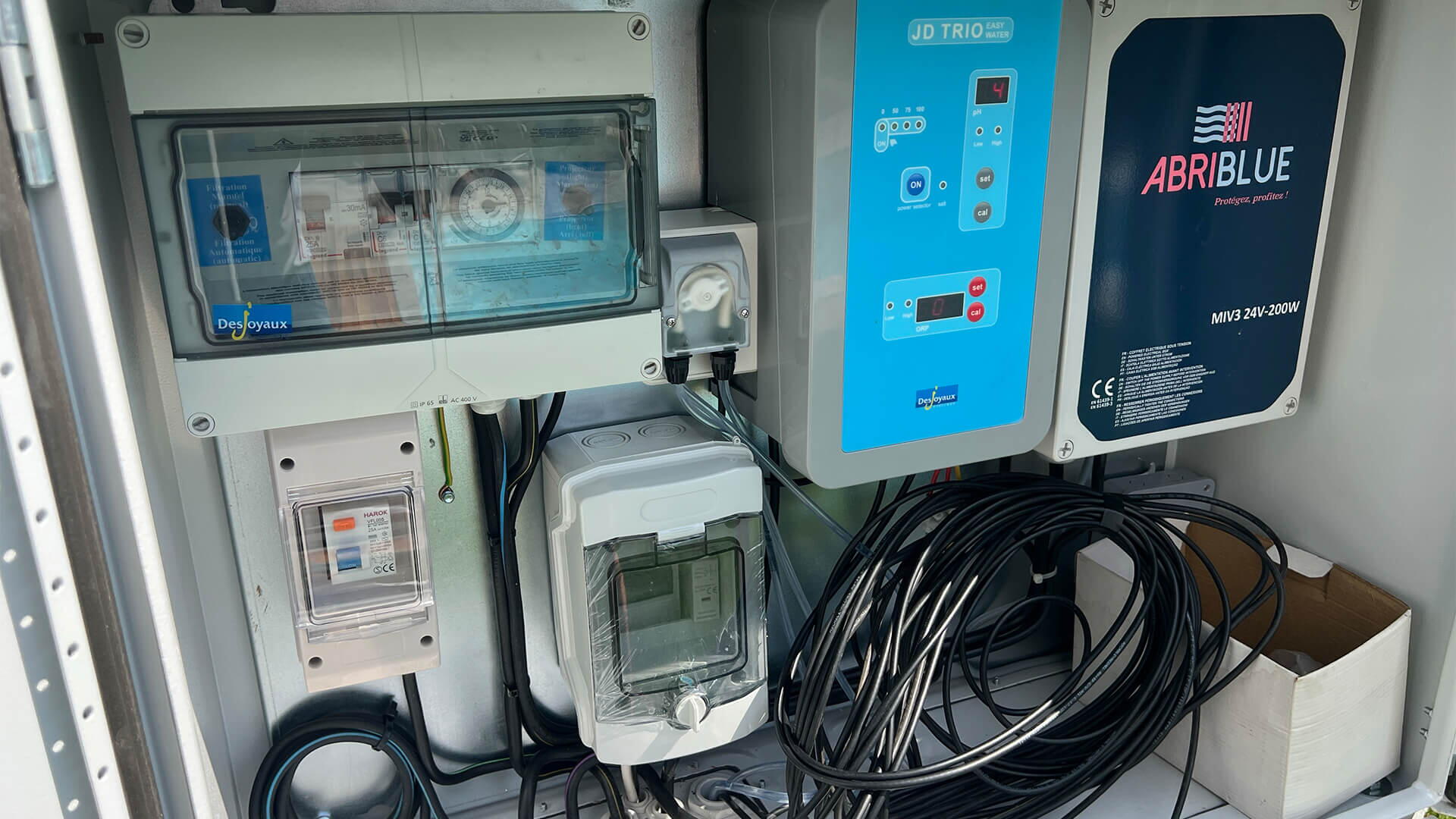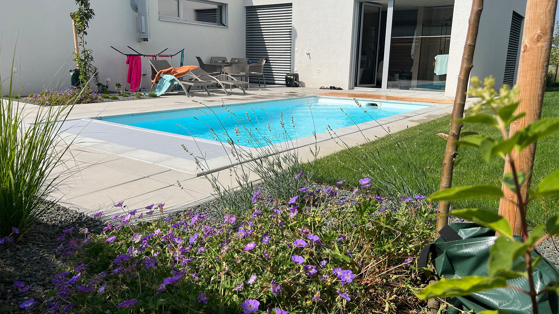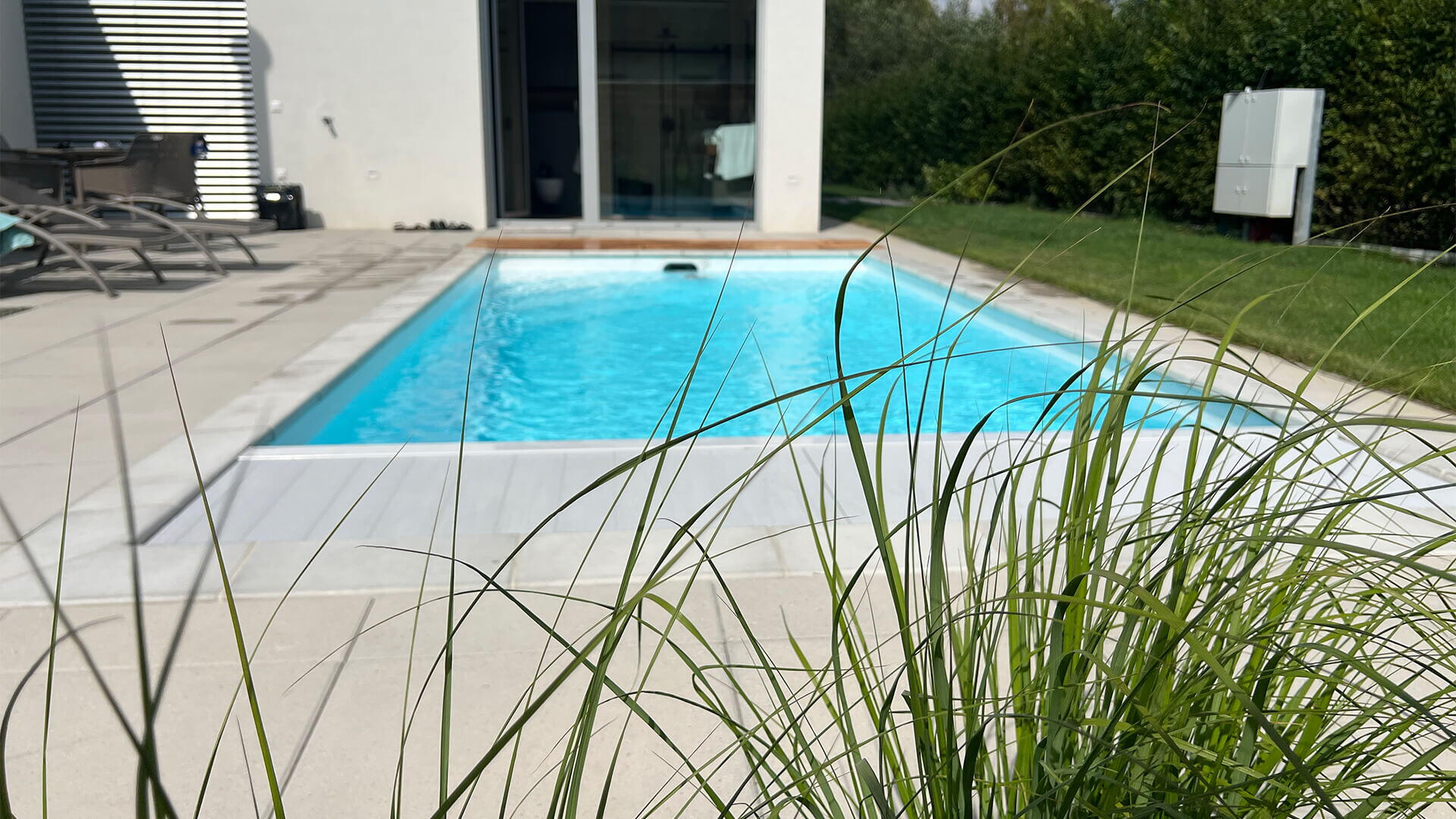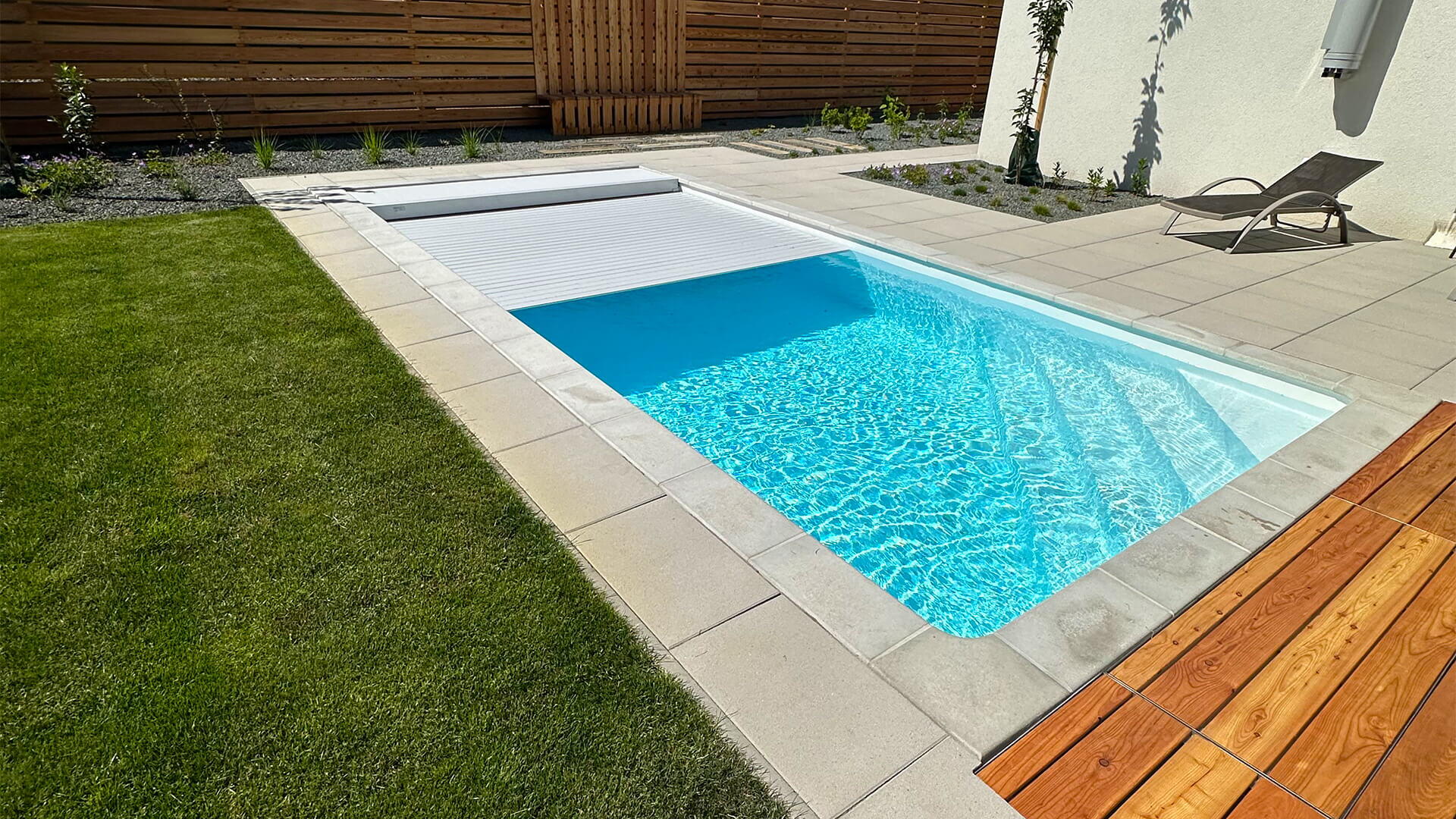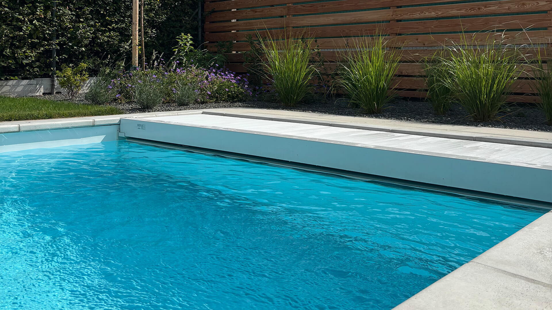 Klient si přál nainstalovat liner v bílé barvě. Bazén tím působí velmi ladně a elegantně. Slaná voda v bazénu a dávkování pH je řešeno automaticky - pomocí automatiky Desjoyaux JD Trio. Čistotu vody udržuje také podvodní lamelové zakrytí bazénu, které si přál zákazník ve světle šedé barvě. To si může klient ovládat pomocí dálkového ovládání a nebo napojit pomocí aplikace do chytrého telefonu.